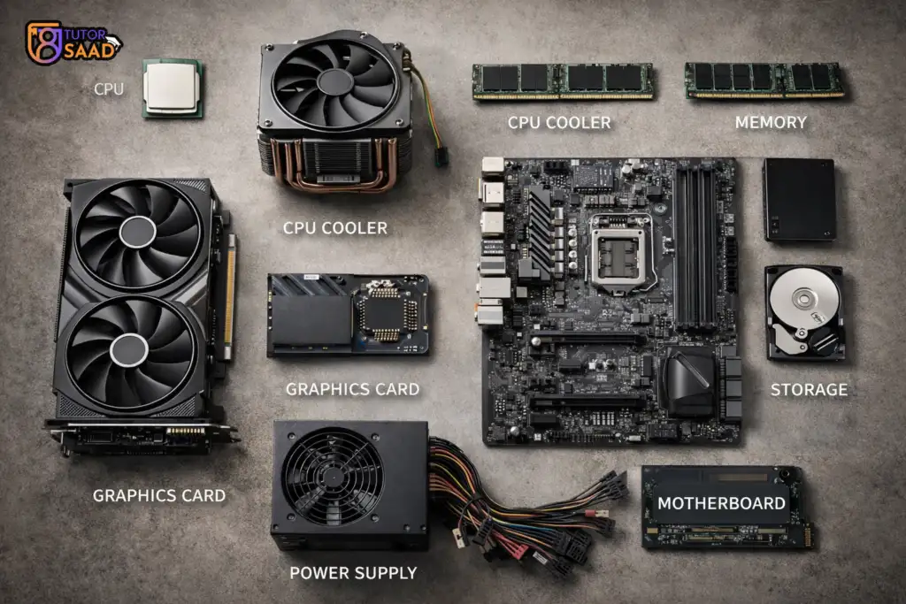 These parts work in concert: the CPU fetches instructions from RAM, processes them, sends data to the GPU for display, and stores long-term info on the drive, all facilitated by the motherboard and powered by the PSU, with fans keeping everything cool