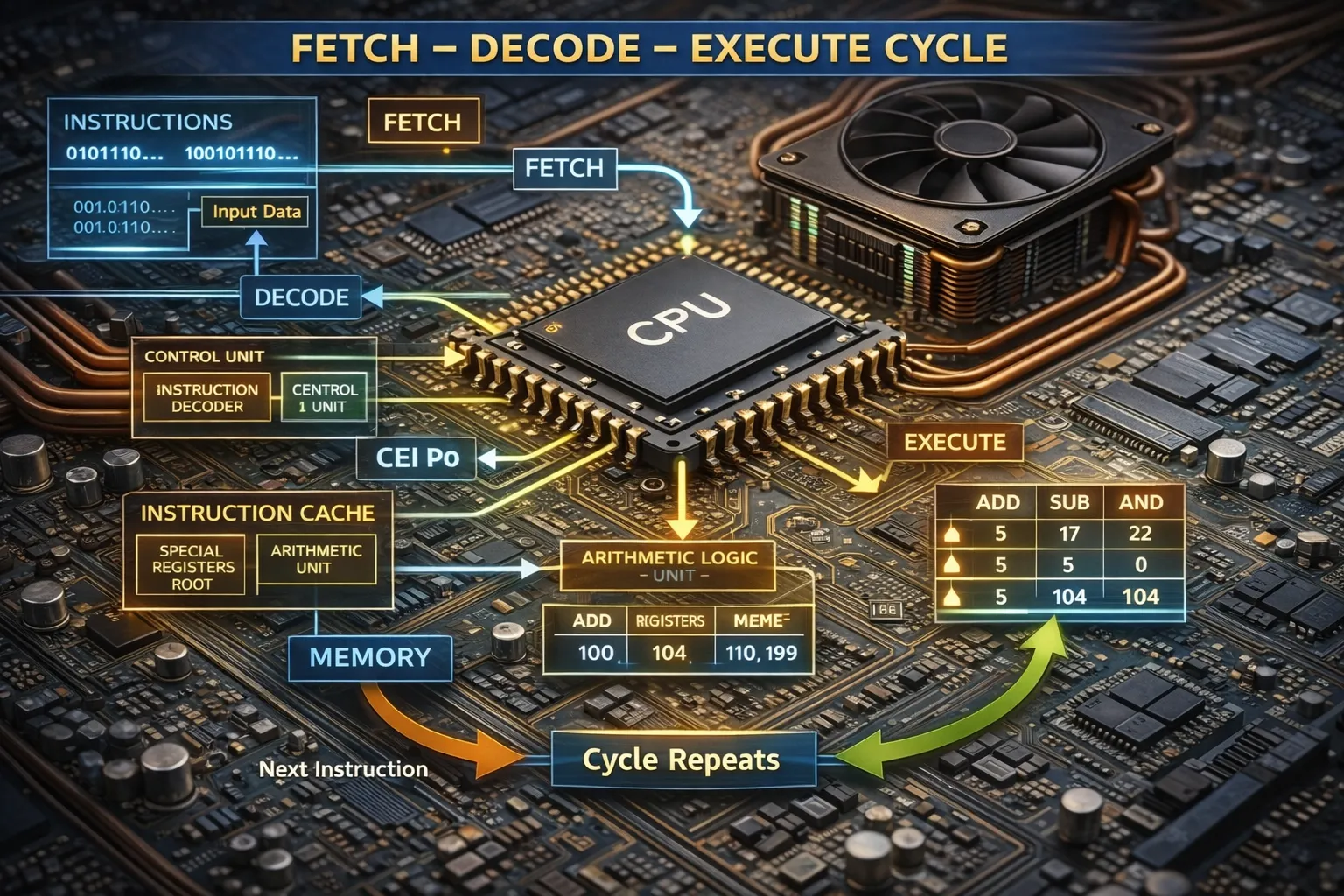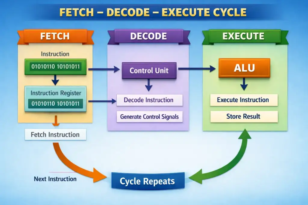 The Fetch–Decode–Execute (FDE) cycle is the fundamental operational loop of every von Neumann CPU. It describes the sequential steps by which the processor retrieves, interprets, and carries out each instruction in a program.